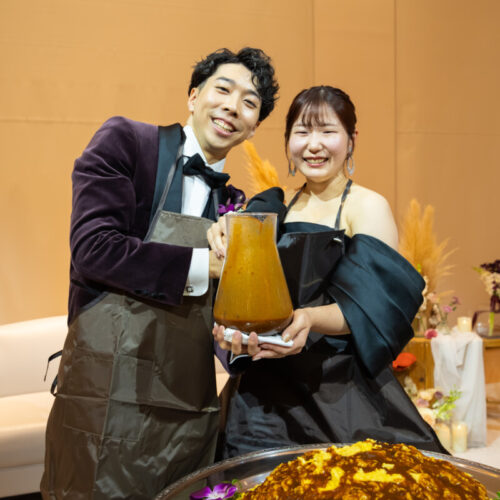 - 定番のケーキ入刀の代わりに、私たちが大好きなオムライスにハヤシソースをかける演出にしました。
