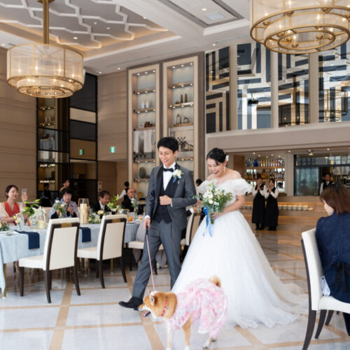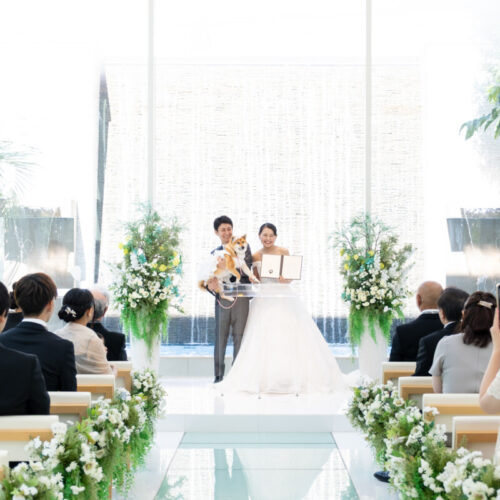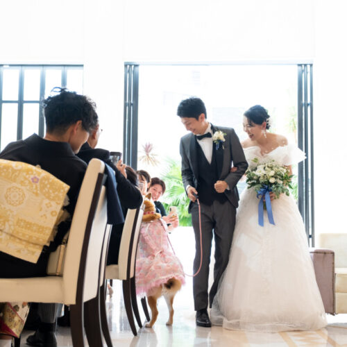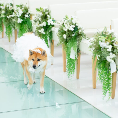 - 私の代わりに愛犬がウェディングドレスからカラードレスにお色直しして再入場する演出をさせてもらいました。温かく迎えられながら会場内を歩き、愛犬と一緒に披露宴も楽しむことが出来ました。