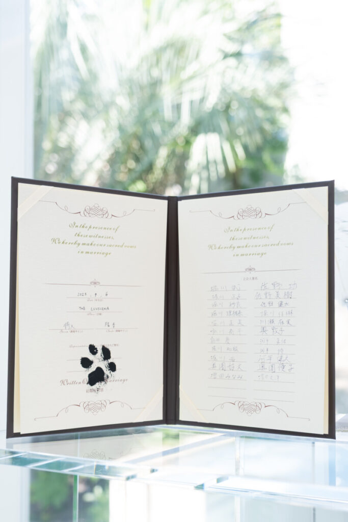 - 結婚証明書への肉球スタンプは予め押した状態でしたが、その場でスタンプを押すふりをする演出をゲストの皆様が喜んでくれたようで嬉しかったです。とても良い記念になりました。